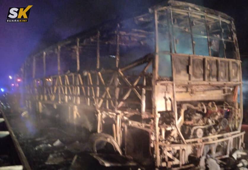 “Kemalangan melibatkan sebuah bas ekspres telah menyeret sebuah motosikal yang terbabas pada ketika itu dan menyebabkan kebakaran bas berkenaan, anggaran kemusnahan terbakar 90 peratus.