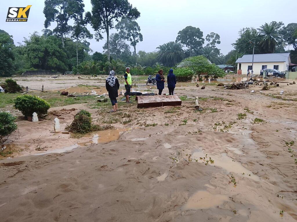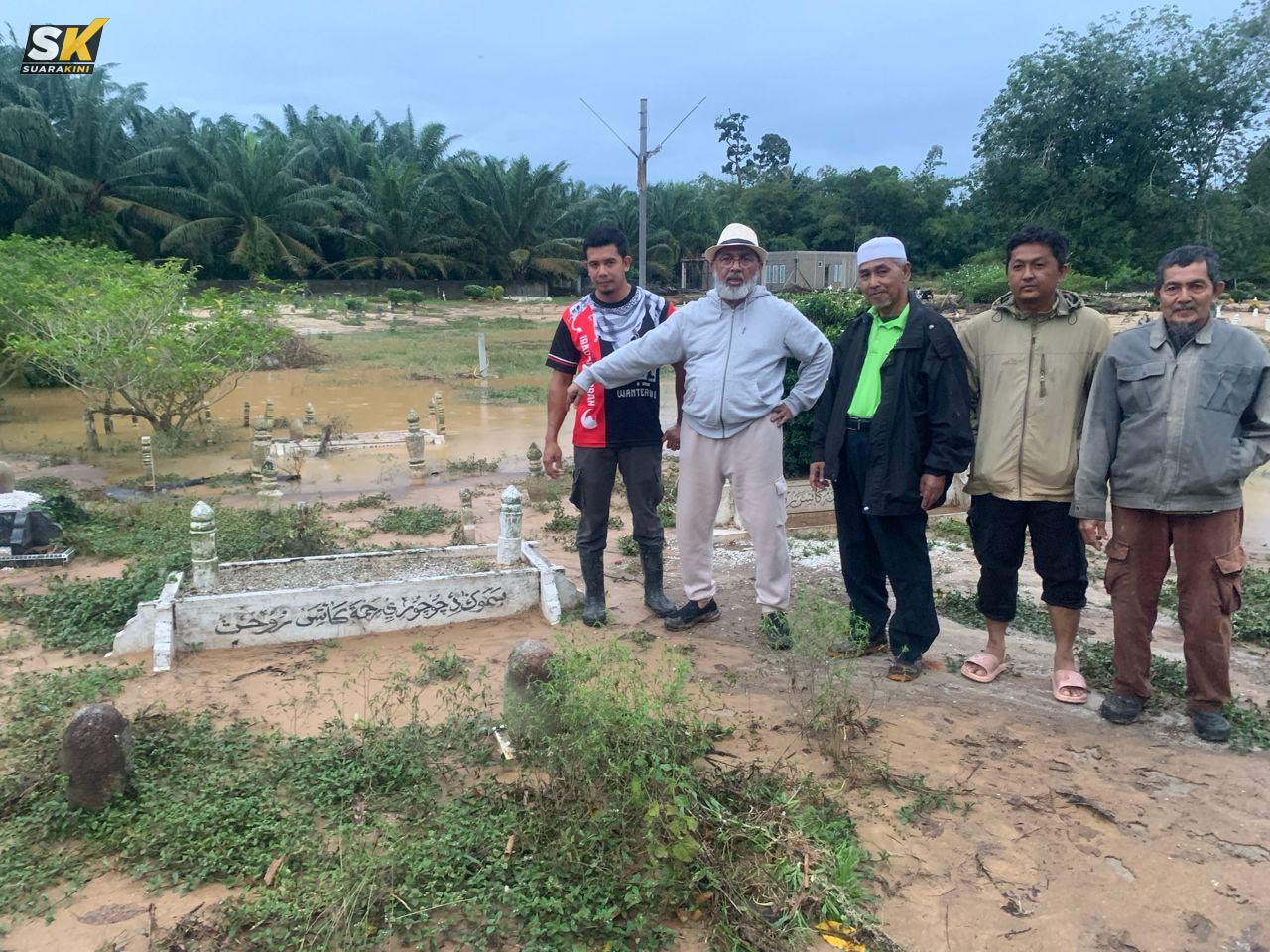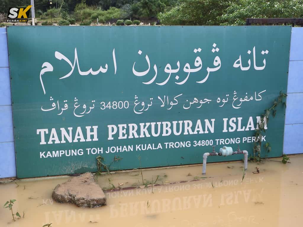 BUKIT GANTANG: Banjir yang berlaku di Daerah Larut Matang dan Selama sejak Khamis malam turut menjejaskan Tanah Perkuburan Islam Kampung Toh Johan, Kuala Trong.