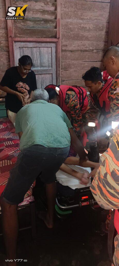 TELUK INTAN: Pasukan bomba membantu memindahkan seorang remaja lelaki orang kurang upaya (OKU) bersama-sama ibunya susulan banjir yang melanda di Kampung Melayu, Langkap di sini malam tadi.
