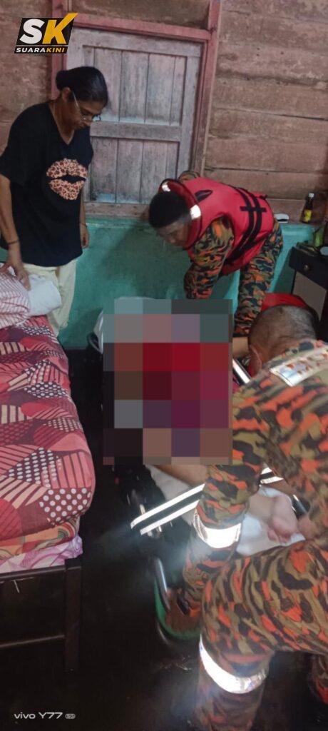 “Anggota dari Balai Bomba dan Penyelamat Teluk Intan serta Ketua Kampung memindahkan mangsa iaitu seorang remaja lelaki OKU bersama ibunya ke Dewan Arena Kampung Attaduri, Langkap.