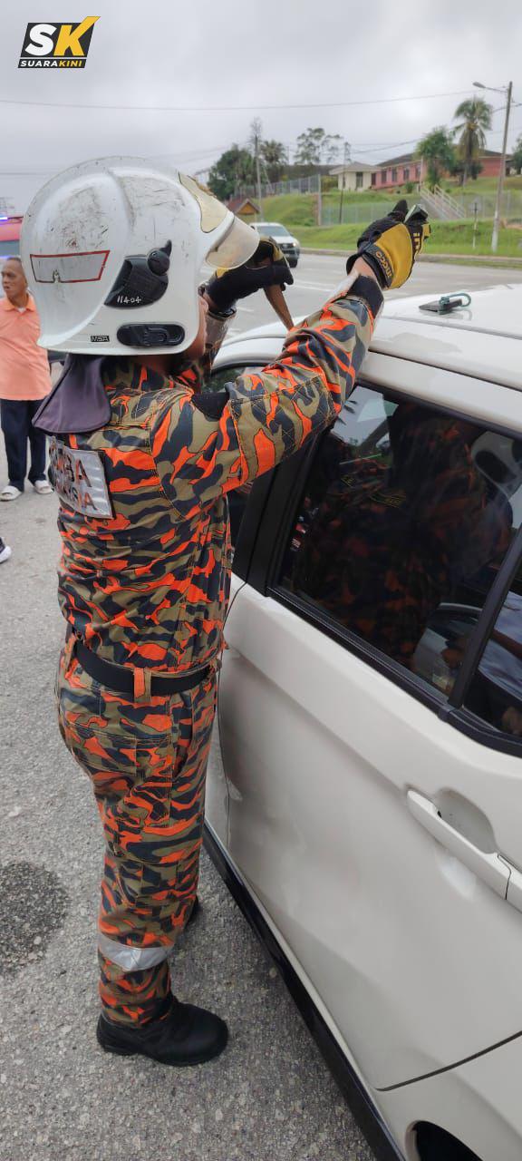 “Bomba kemudiannya memakai pakaian lengkap dan membuka kereta tersebut dengan peralatan khas.