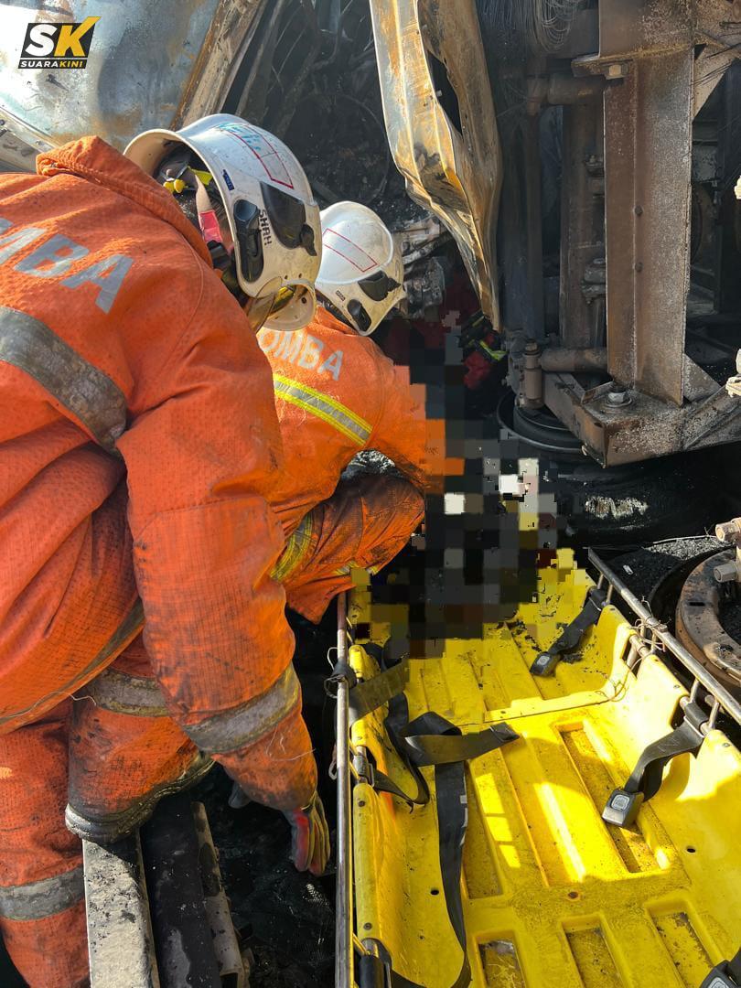 “Maklumat dari ketua operasi terdapat seorang mangsa ditemui mati terbakar iaitu pemandu treler muatan pasir.