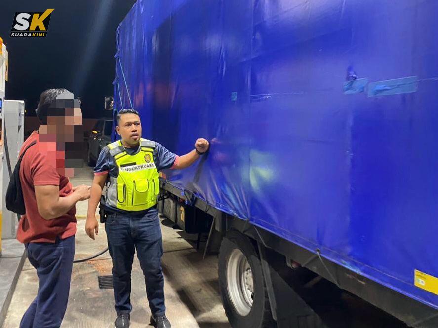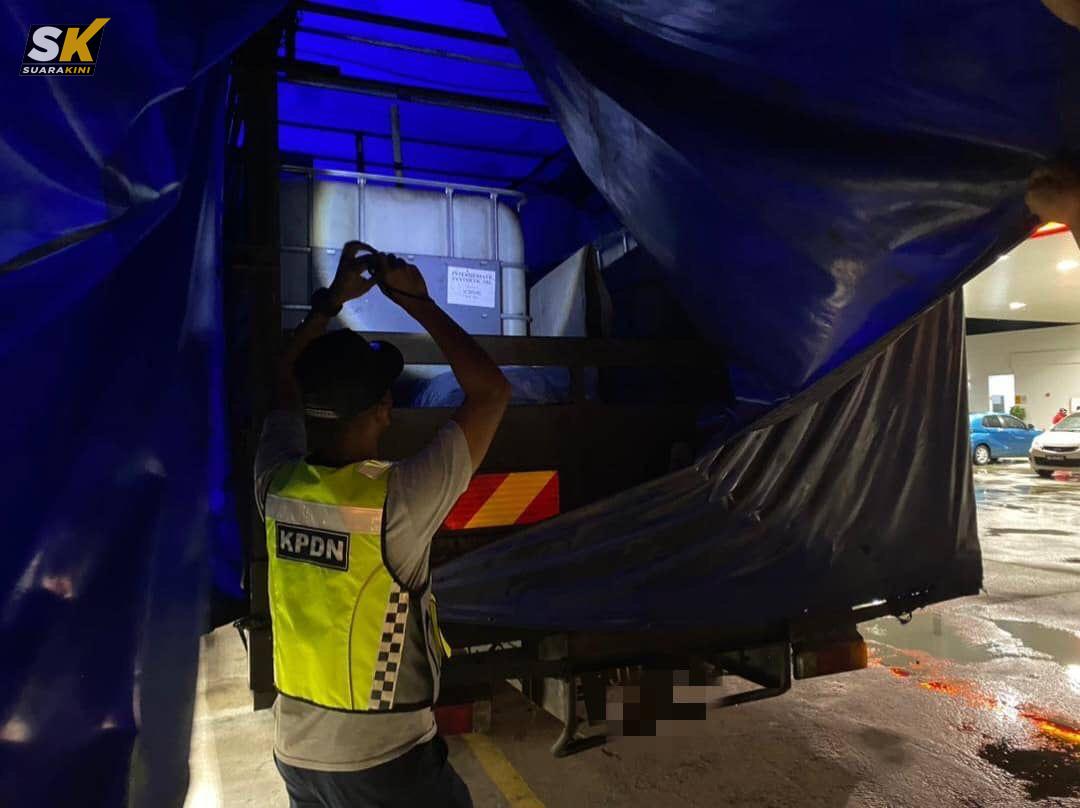 “Pemeriksaan lanjut ke atas lori yang bertutup kain kanvas telah menemui sebanyak 10 buah tangki dengan anggaran sebanyak 3,500 liter cecair yang disyaki minyak diesel berada di atas lori tersebut.