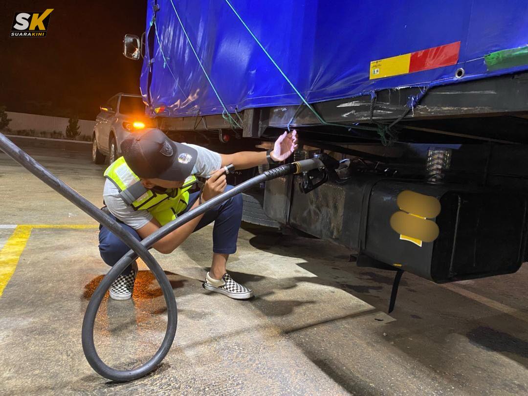 “Pemeriksaan lanjut ke atas lori yang bertutup kain kanvas telah menemui sebanyak 10 buah tangki dengan anggaran sebanyak 3,500 liter cecair yang disyaki minyak diesel berada di atas lori tersebut.