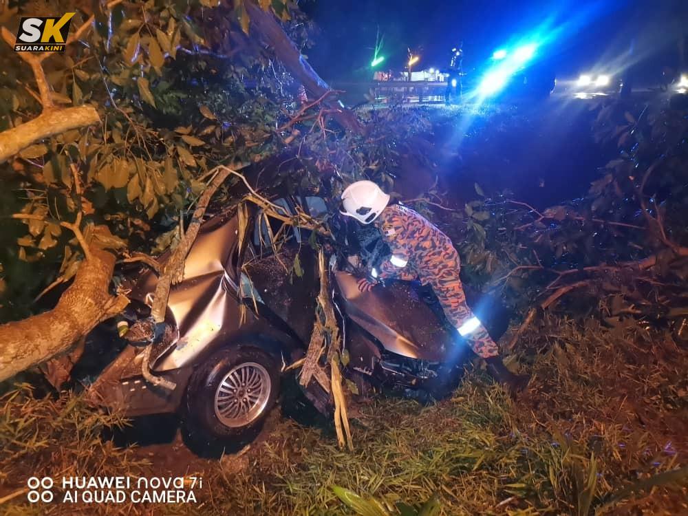 “Kemalangan membabitkan sebuah kereta jenis Kia Spectra yang terbabas di tepi jalan dan melanggar pokok.