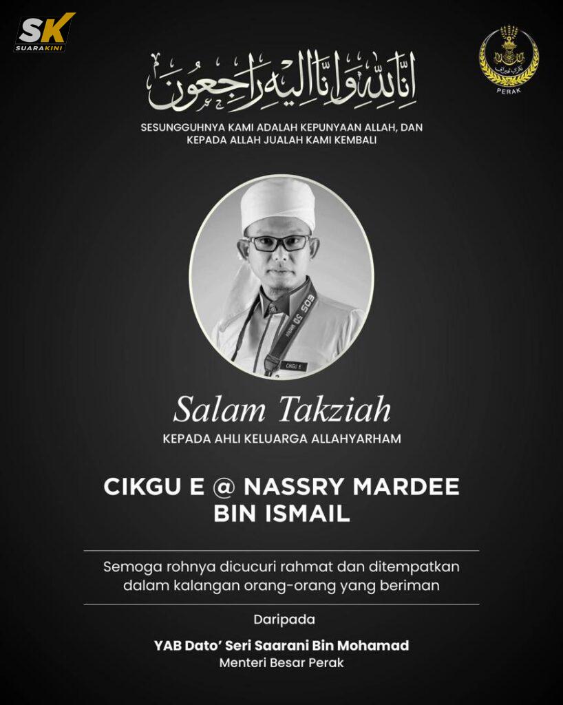 “Nassry Mardee Bin Ismail dah meninggalkan kita semua. Moga Allah ampuni dia, rahmati dia, maafkan dia, muliakan kematian dia, lapangkan kubur dia, jadikanlah syurga sebagai ganti tempat tinggal dia dan berilah kesabaran kepada ahli keluarganya, semoga dia di tempatkan di kalangan orang yang beriman,” tulis hantaran berkenaan.