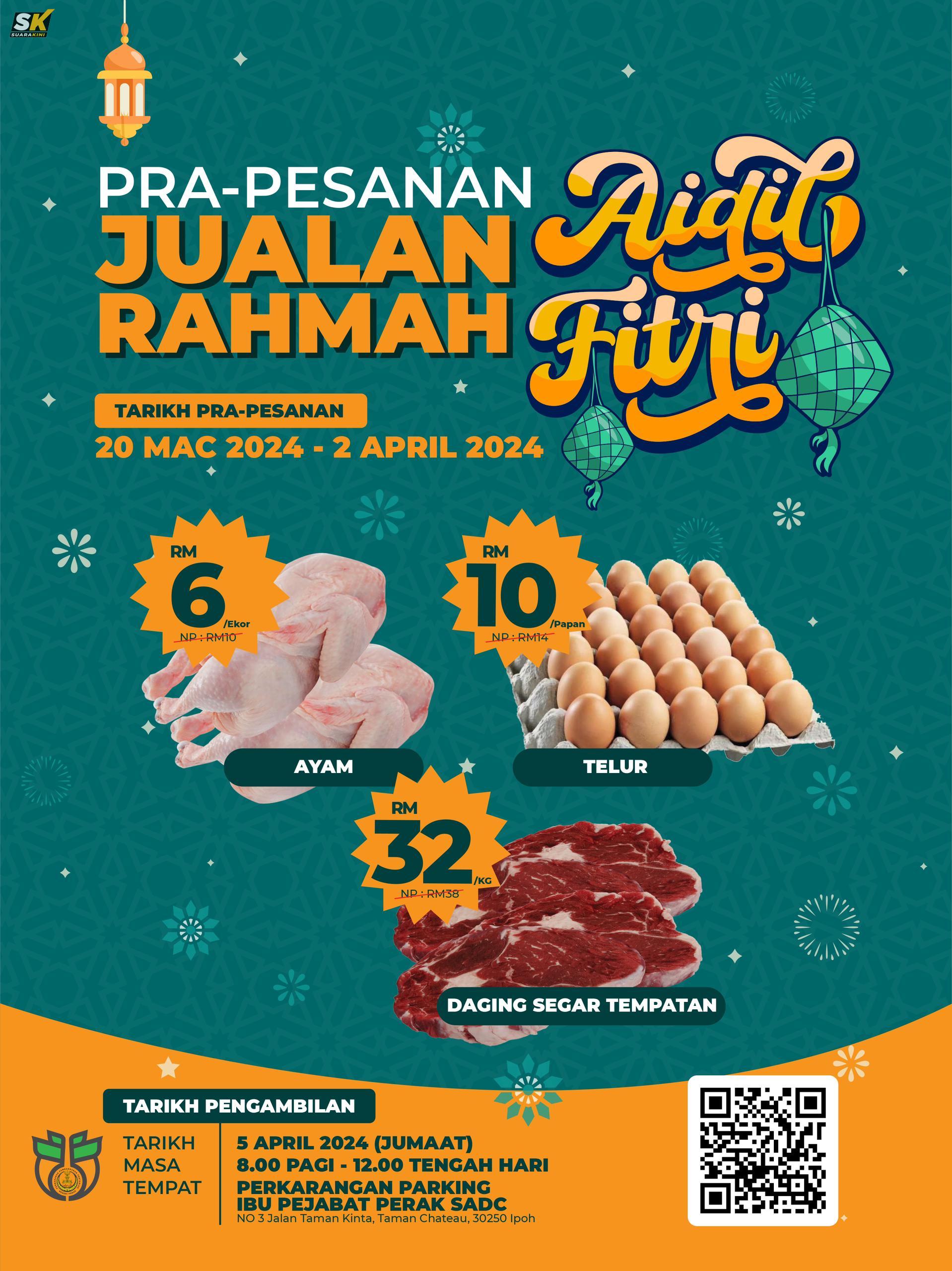 Mengenai Jualan Rahmah Aidilfitri, beliau berkata, orang ramai boleh membuat tempahan pra pembelian daging, ayam dan telur dengan harga jauh lebih murah.