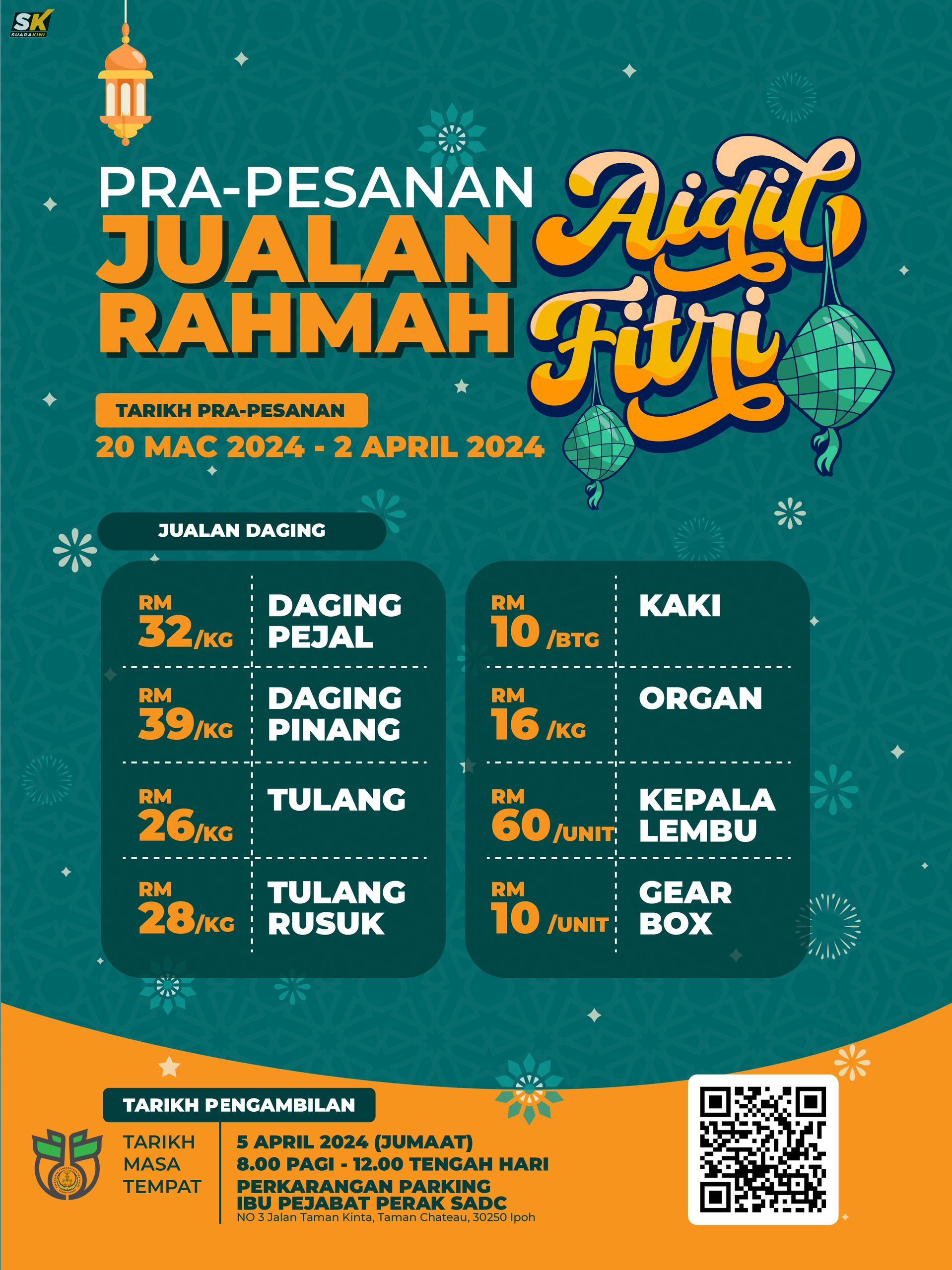 Menurutnya, tempahan boleh dibuat mulai 20 Mac hingga 2 April dan tempahan boleh diambil di pejabat Perak SADC pada 5 April.