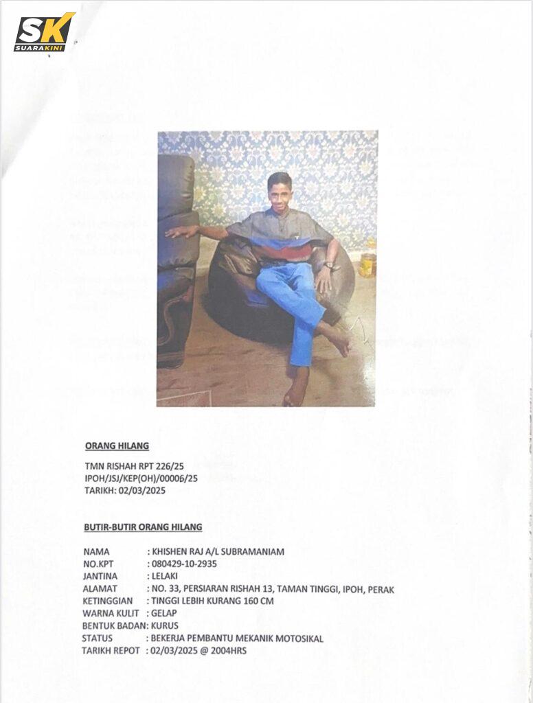 Pemangku Ketua Polis Daerah Ipoh, Supt. Mohamad Sajidan Abdul Sukor berkata, dua individu itu dikenali sebagai Khishen Raj a/l Subramaniam dan remaja perempuan Orang Asli Nirma a/p Jimmy.