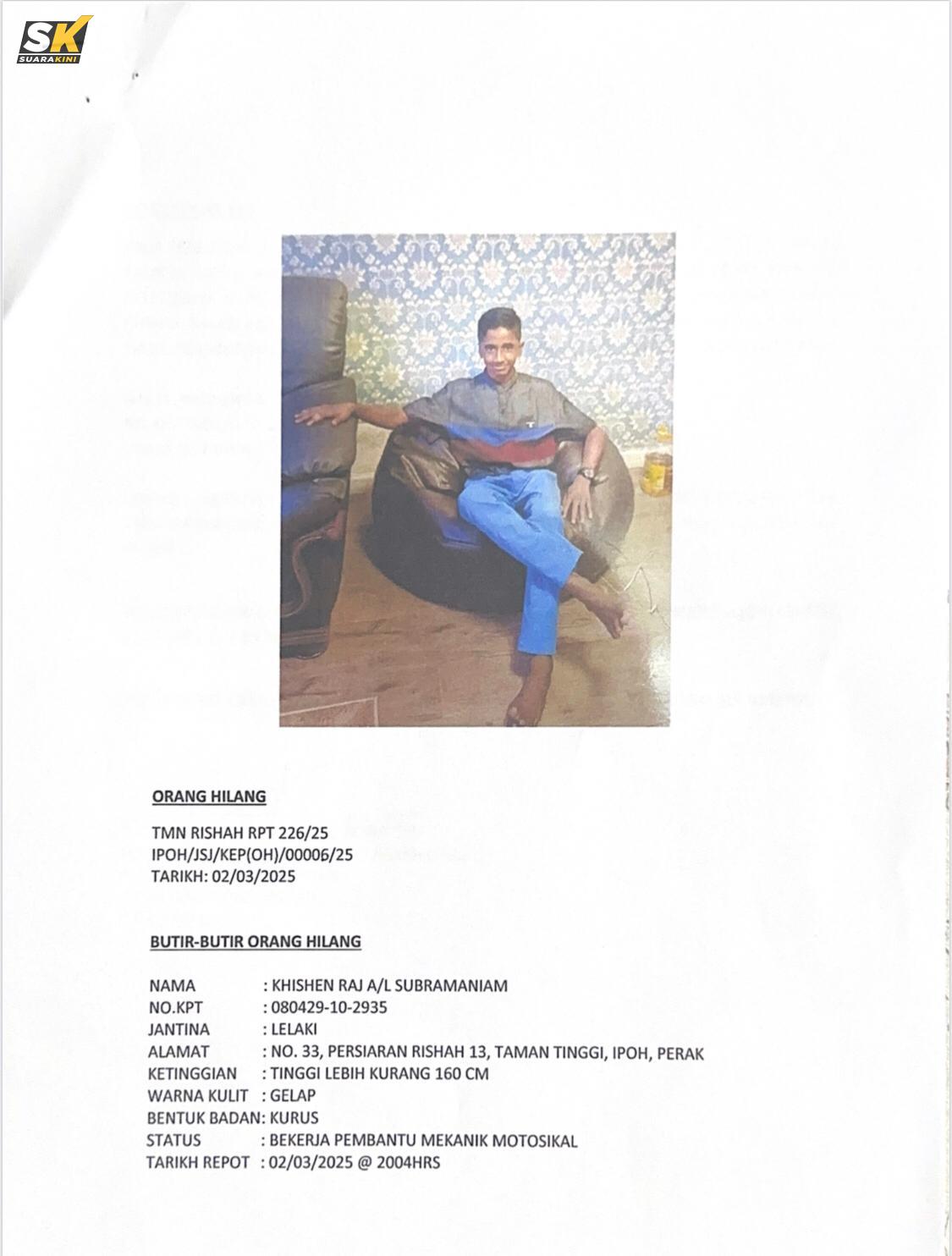 Pemangku Ketua Polis Daerah Ipoh, Supt. Mohamad Sajidan Abdul Sukor berkata, dua individu itu dikenali sebagai Khishen Raj a/l Subramaniam dan remaja perempuan Orang Asli Nirma a/p Jimmy.