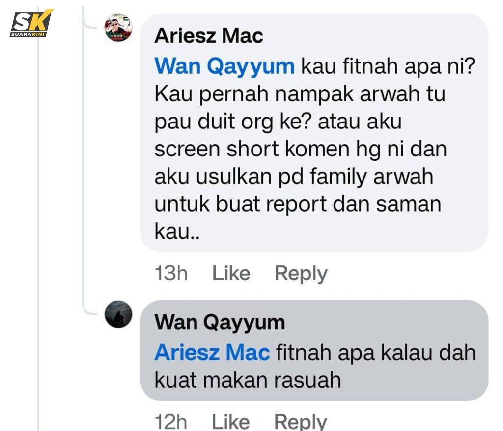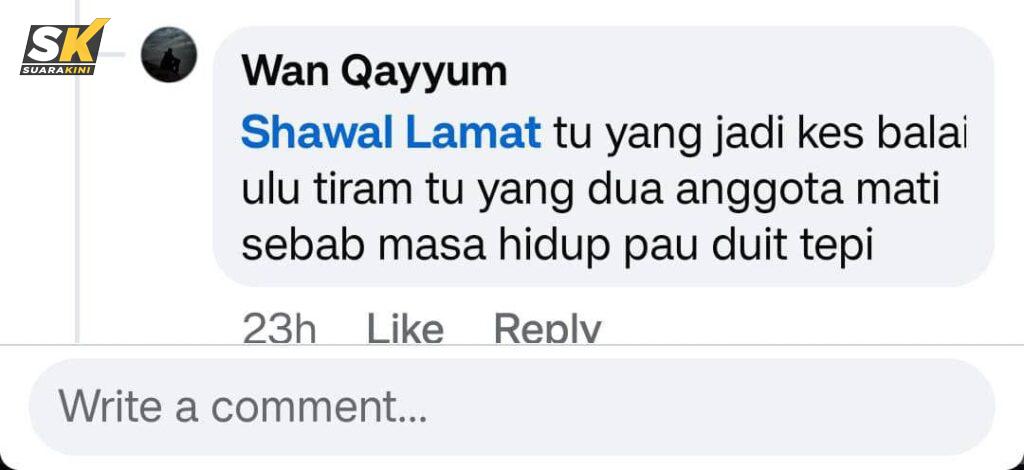 Menerusi komen di ruangan Facebook yang tular, pengguna dengan nama Wan Qayyum menulis “tu yang jadi kes balai ulu tiram tu yang dua anggota mati sebab masa hidup pau duit tepi” dan “fitnah apa kalau dah kuat makan rasuah”.