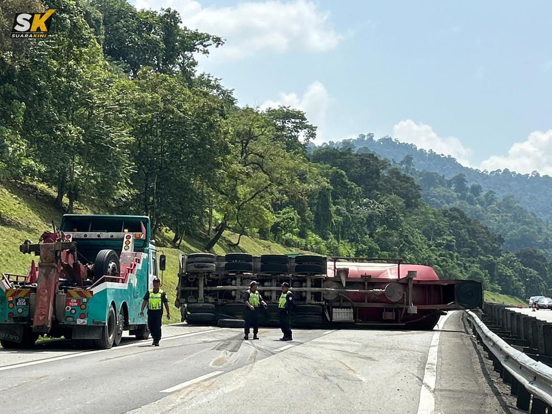 “Apabila sampai di lokasi kejadian, lori yang dipandu di lorong kiri telah hilang kawalan dan terbabas melanggar besi penghadang di tengah jalan menyebabkannya terbalik serta melintang sehingga menutup kedua-dua laluan jalan,” katanya dalam kenyataan di sini, hari ini.