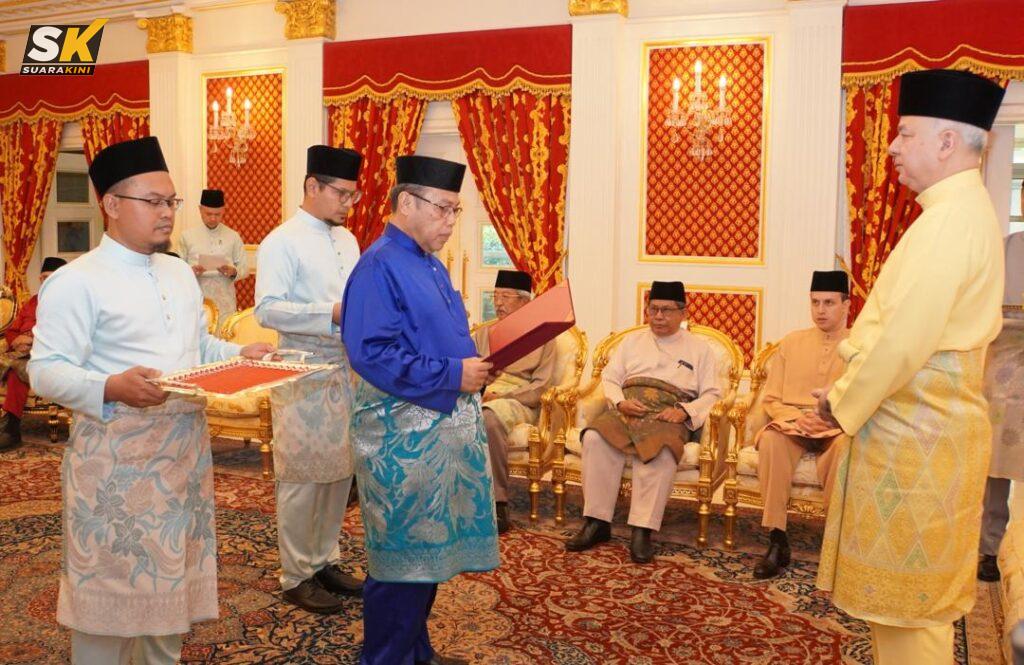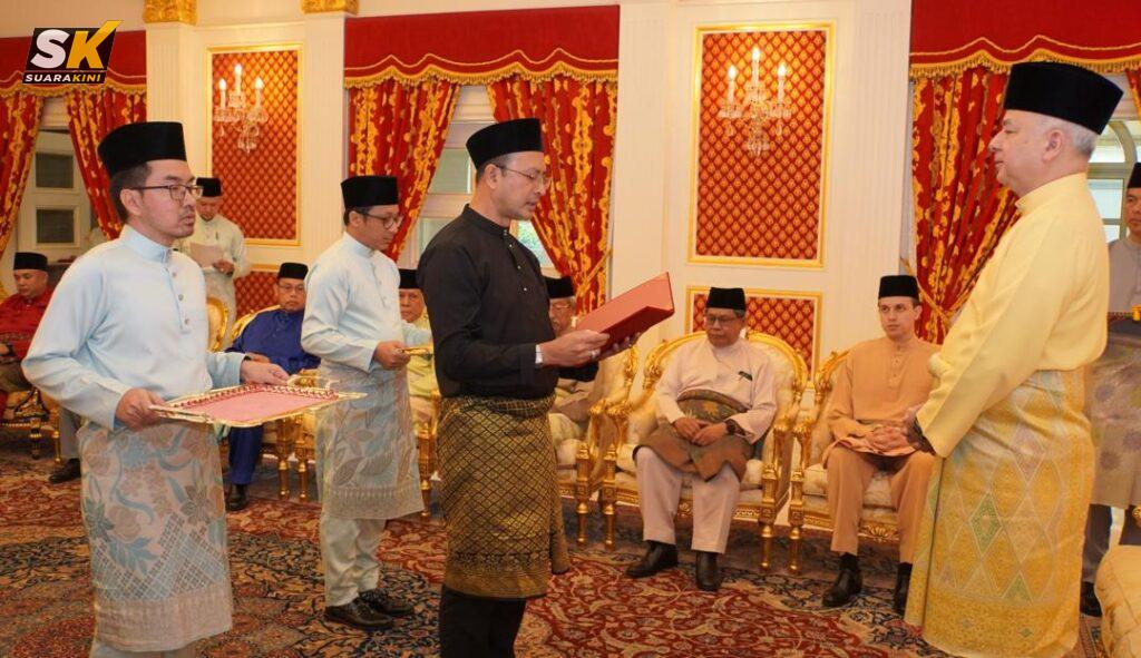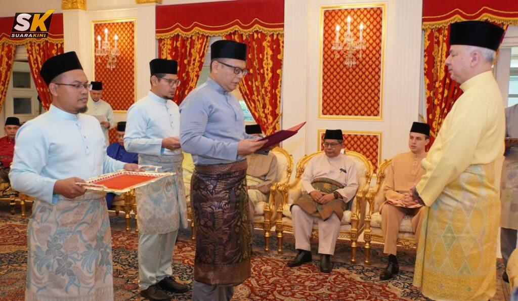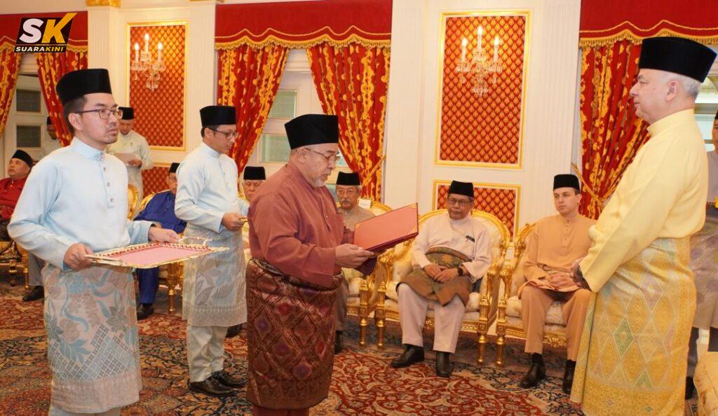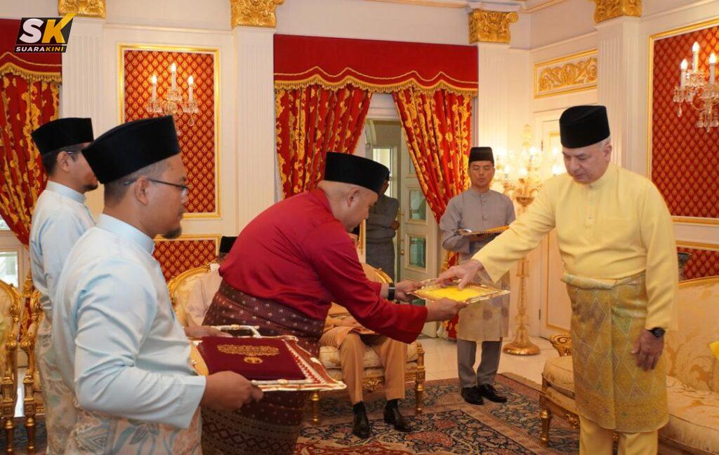 IPOH: Sultan Perak Sultan Nazrin Muizzuddin Shah berkenaan menerima bayaran zakat perniagaan berjumlah RM3,240,255.33 daripada lapan syarikat korporat kepada Majlis Agama Islam dan ‘Adat Melayu Perak (MAIPk) di Istana Perak, Changkat Persekutuan, Kuala Lumpur, hari ini.