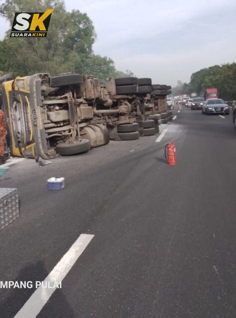 SIMPANG PULAI: Seorang lelaki cedera tersepit setelah treler muatan tepung yang dipandu terbalik di Kilometer (KM) 292.1 Lebuhraya Utara Selatan (PLUS), arah selatan hari ini.
