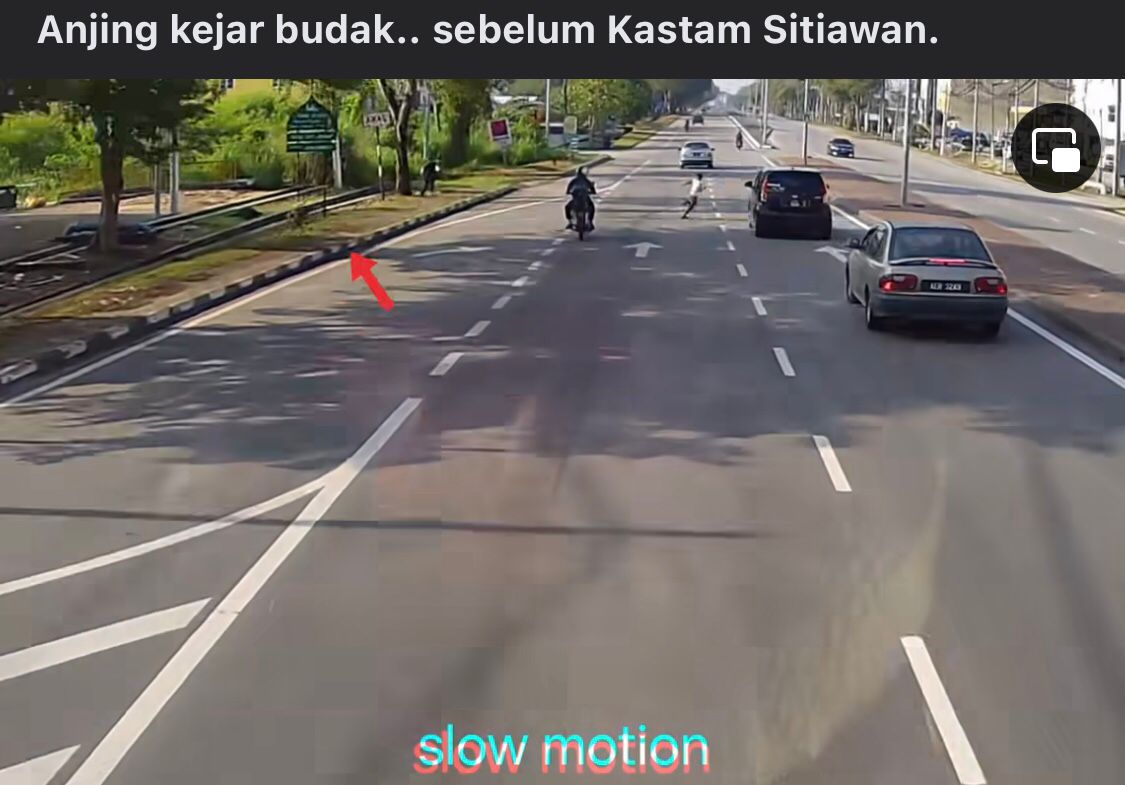 Terdahulu, tular di media sosial menunjukkan seorang kanak-kanak berlari di jalan raya dipercayai dikejar seekor anjing sehingga menyebabkan dia hampir dilanggar sebuah kereta.