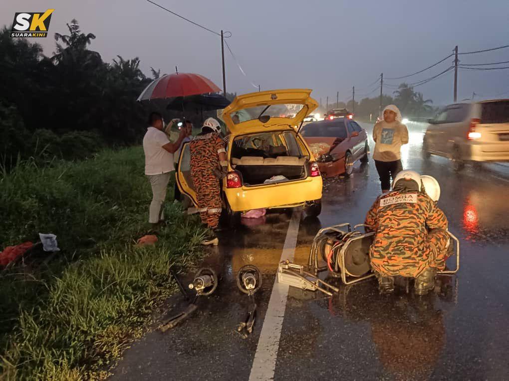 Menurut Penolong Pengarah Bahagian Operasi Jabatan Bomba dan Penyelamat Malaysia (JBPM) Perak, Sabarodzi Nor Ahmad, kemalangan itu membabitkan kereta jenis Perodua Kancil dan Proton Perdana.